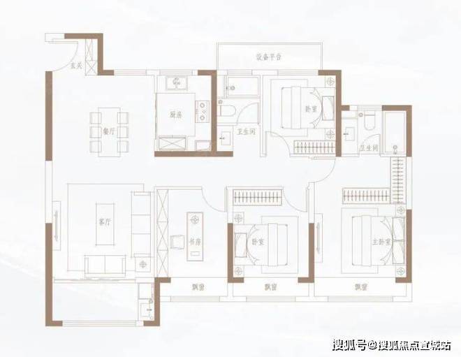 138㎡户型开间阔绰,4室2厅2卫,三房朝南,均赠送飘窗。