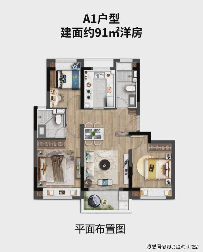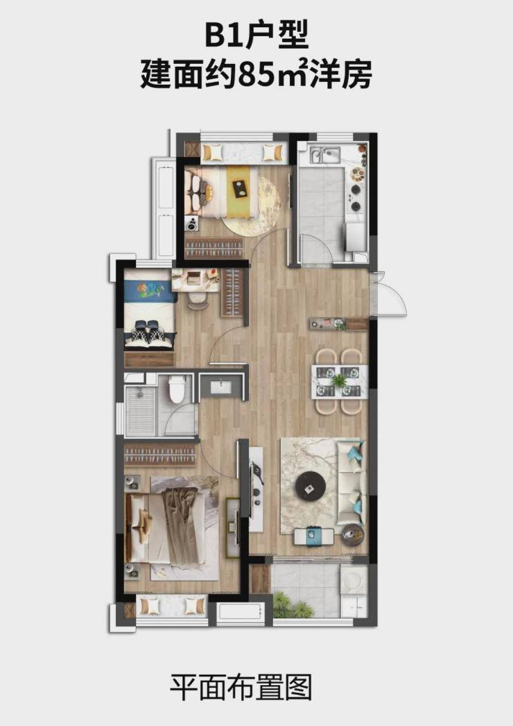 洋房:总高 8 层,1T2H/2T4H,建面约 72-91㎡,三房两卫设计,得房率约 78%,精装交付。