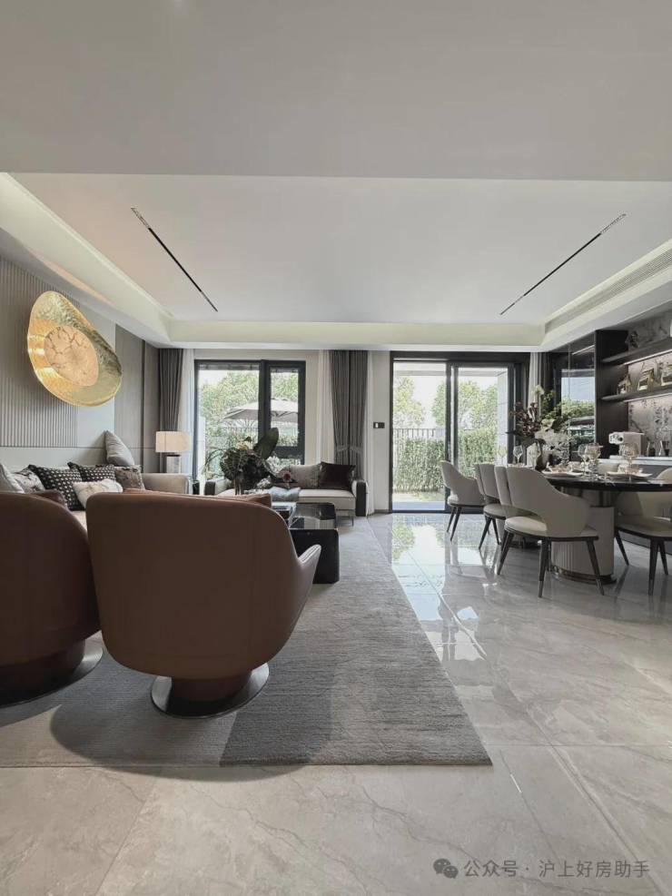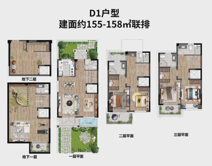 联排别墅:总高 3 层,独立梯户,建面约 160㎡,地上 3 层 + 南北双庭院,6 米挑高餐客厅 + 双套房主卧,毛坯交付。