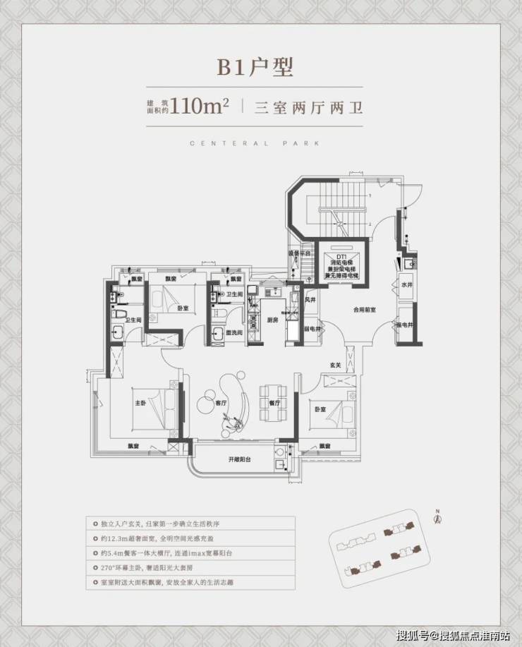 建面约110㎡B1户型,南向面宽也做到了约12.3米,单就这个面宽就秒杀了市面上同类型或同价位段的新盘.