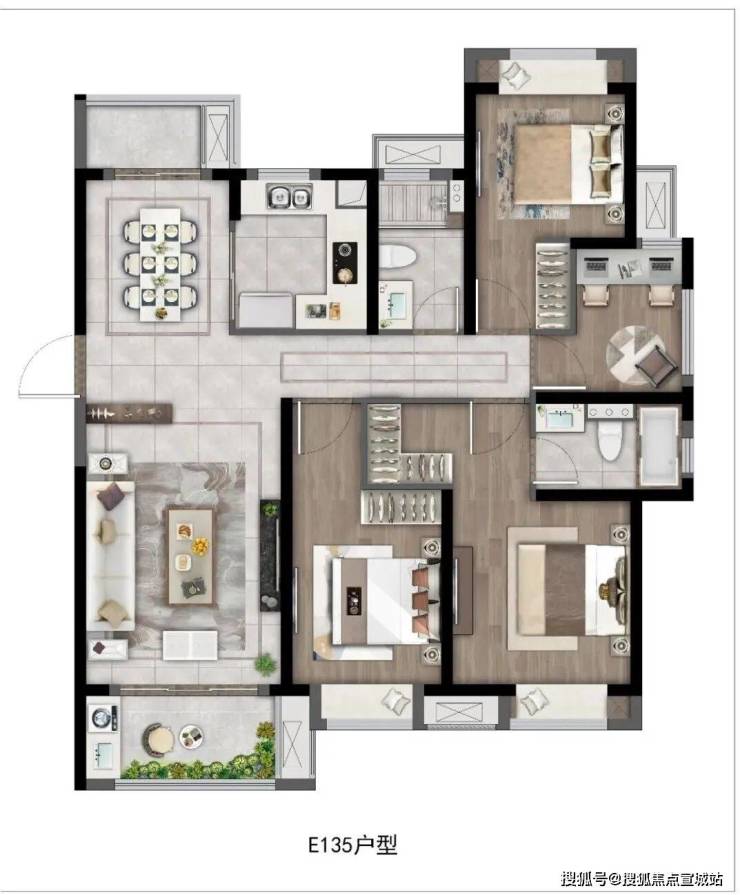 建面约135㎡4房2厅2卫,做到了三开间朝南+双卧室朝南+主卧套房设计+南北通透+动静分离+南北双阳台,这是一个“一步到位”的大4房户型。