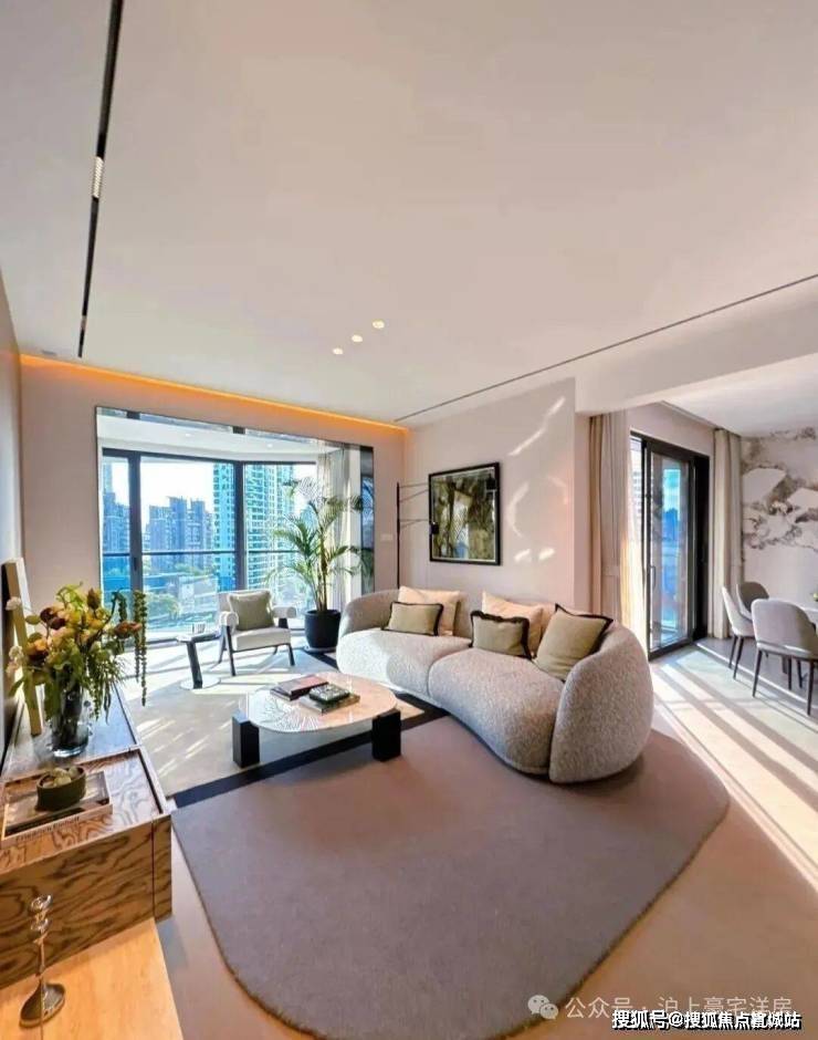 外立面通过石材、铝板及真石漆相结合呈现 十足的未来感 。在有限的地块内,建筑大师及设计团队反复研究建筑方案,最终巧妙的将江景与纯现代外立面相融合,呈现 大露台环幕景观视野 ,使居住者能够拥享临岸滨江风景。