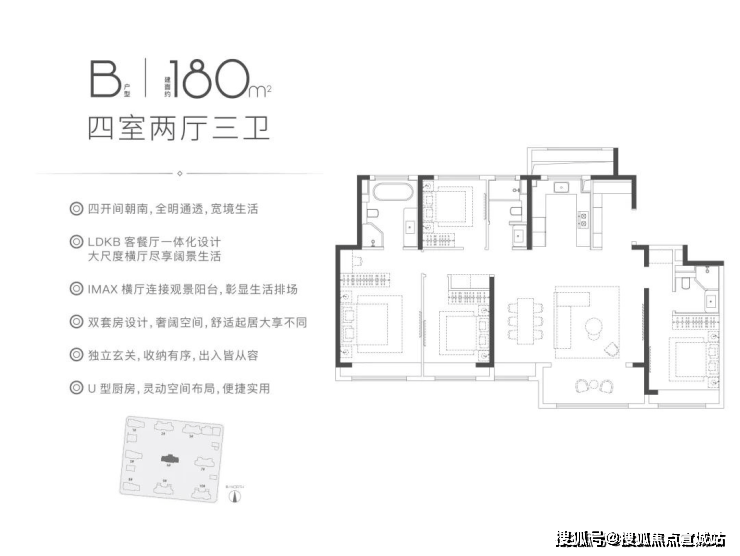 约172㎡和180㎡的4房3卫的户型,南向五开间朝南,整体的采光度、尺度感堪比别墅。