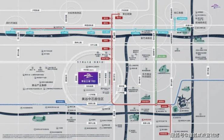 南北向5号线与东方美谷大道交汇于奉浦大道站,形成了双轴发展极核;奉浦TOD已布局了奉贤首个综合性三级医院新华医院奉贤院区(在建)、大型公共文化建筑综合体海之花市民中心、万达广场(在建)、高能级的配套规划,打造美谷中央居住区。