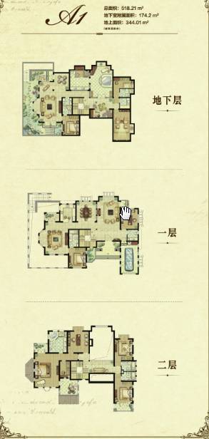 A1地上388㎡(赠送)下沉庭院220㎡花园677㎡B1地上326㎡(赠送)下沉庭院176㎡花园320㎡B2地上342㎡(赠送)下沉庭院196㎡花园440㎡C1地上309㎡(赠送)下沉庭院185㎡花园380㎡C2地上266㎡(赠送)下沉庭院170㎡花园410,C3地上309㎡(赠送)下沉庭院185㎡花园500㎡楼层数:地上2层,地下1层