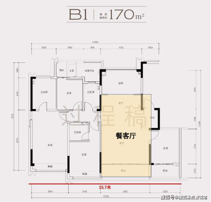 170㎡,4开间超南面宽达15.7米;餐客厅面积达到44个平方米;厨房开间达到4.35米。