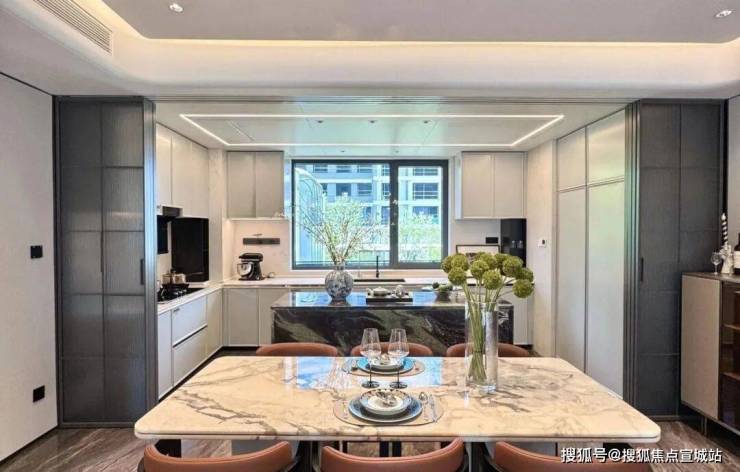 前所未及的超大尺度,结合曲面的艺术设计,使得整个室内的居住品质得到了质的飞跃!功能区的设计也充满了人本的细节设计和思考,阔朗的超大厨房设计,定制岛台,升降式插座,实现大家族式的社交式烹饪。