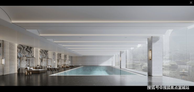极具现代美学风格的恒温泳池,面积约250㎡,几乎达到苏州市面上住宅会所中泳池的最大规模。业主畅游其中,可透过玻璃幕墙欣赏到中央景观,仿佛在城市森林中与自然共舞。