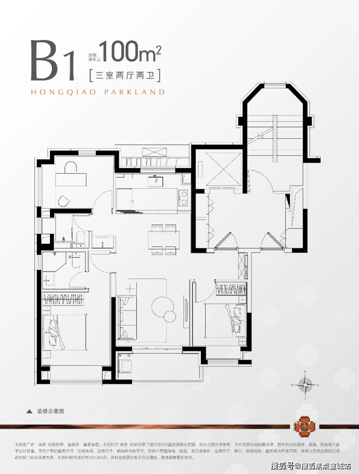 B1户型建面约100㎡,三开间朝南的设计,提高了采光的效率。入门玄关的设计预留了独立收纳空间,实用性更强!无过道浪费更是延伸了空间的尺度三房的空间格局,也可根据不同家庭的需求灵活运用。