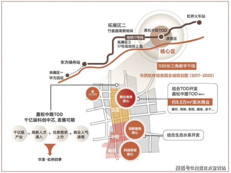 随着大虹桥科创功能西移发展的趋势,青浦新城基于“一城两翼,一带三核”发展战略目标,通过17号地铁线串联起三大核心节点,东起徐泾北斗产业基地,西到金泽华为研发基地,中部核心就是赵巷市西软件信息园,未来这条产业带上预期将会有数十万人口导入。