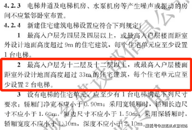 ② 5.1起执行住宅新国标,最高入户层为十二层及十二层以上,或最高入户层楼面距室外设计地面高度超过33m的住宅建筑,每个住宅单元应至少设置2台电梯。