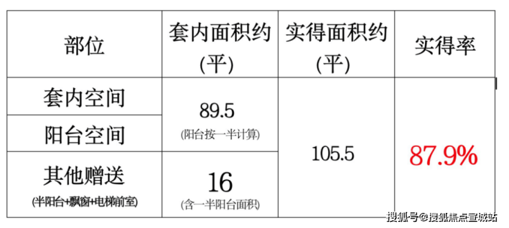 可以看出,对比市面上常规产品约75-78%的得房率,就算加上飘窗。实得率在80%左右,但本项目的实得率却做到了惊人的88-92%,套内面积普遍比常规产品多10%!