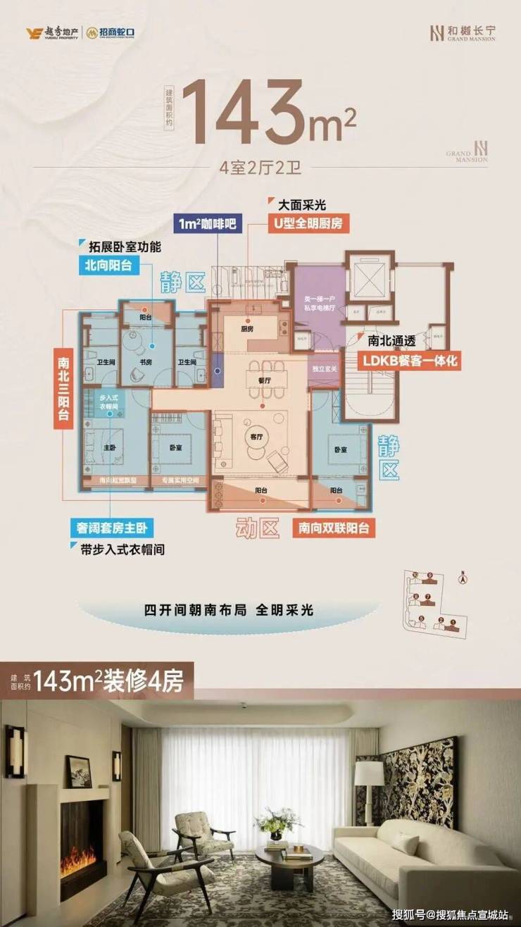① 新政后沪上市区首个多阳台户型。约120㎡3房做了南北双阳台,约143㎡4房做了三阳台,且每个户型都可私享6-8㎡电梯前厅。无论是采光方面、还是赠送面积,都到了next level!