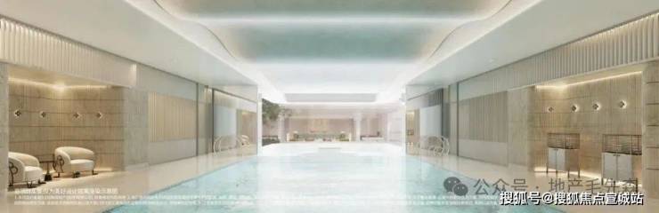 首创270度无界“悬浮”泳池,约400方的体量,3泳道,大量石材装饰,背后是极高的施工成本,通过大面的落地玻璃打通室内外的边界。