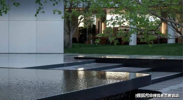 步入社区大堂后,一座叠水庭院成为视觉焦点。水流从阶梯式砂岩平台倾泻而下,与镜面水池相接,形成“声景”与“视景”的双重沉浸。