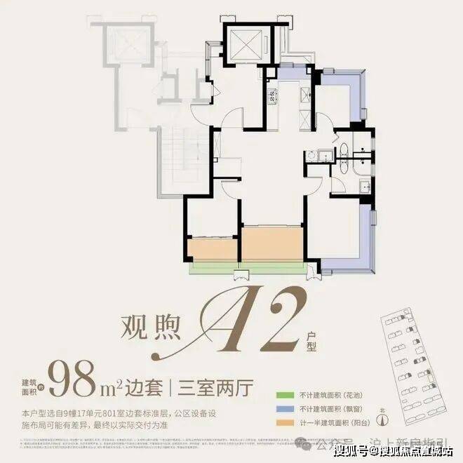 约98㎡3房:类一梯一户、全屋飘窗为标配,双阳台+花池是核心亮点(市面双阳台户型起步多为约110㎡),整体附赠约23㎡,是罕见的高实得率精致户型。