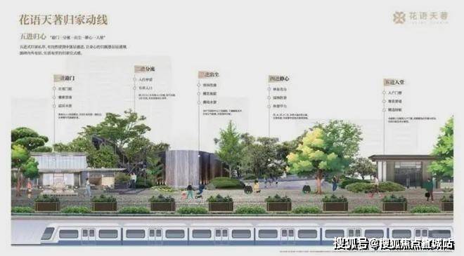 一轴为花溪水轴,串联「深涧花潭、迎春望岳、花谷林境」等十二雅趣花园空间,从门庭到社区,从宅前到入户,移步异景,景观与生活交融。花语天著以情景交融的设计理念,营造全龄乐享的理想生活空间。