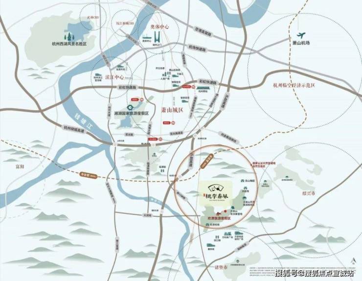 交通配套:紧邻沪昆高速、绍诸高速、时代大道、风情大道等主干道,经风情大道可快速达萧山主城,时代大道可直抵滨江核心与钱江新城;规划中的杭州中环线及地铁 15 号线建成后,将纳入主城半小时生活圈。