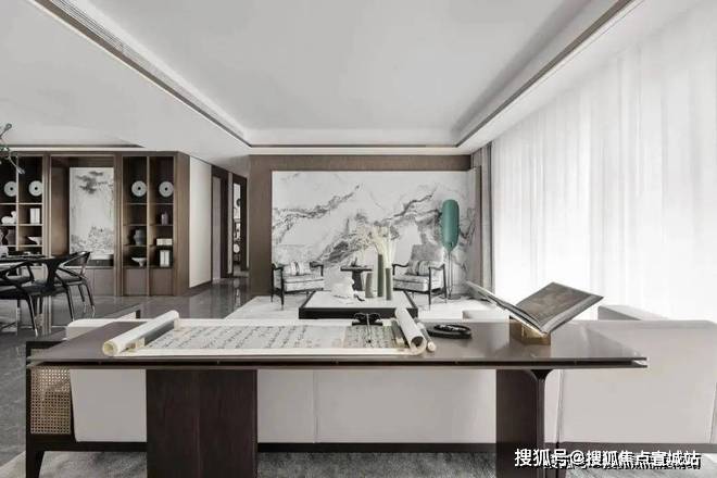 书房空间被设置在了客厅的后方,二者并没有明确的界限和分隔,仅以沙发进行隔断。让空间更显宋式美学的清幽之感。