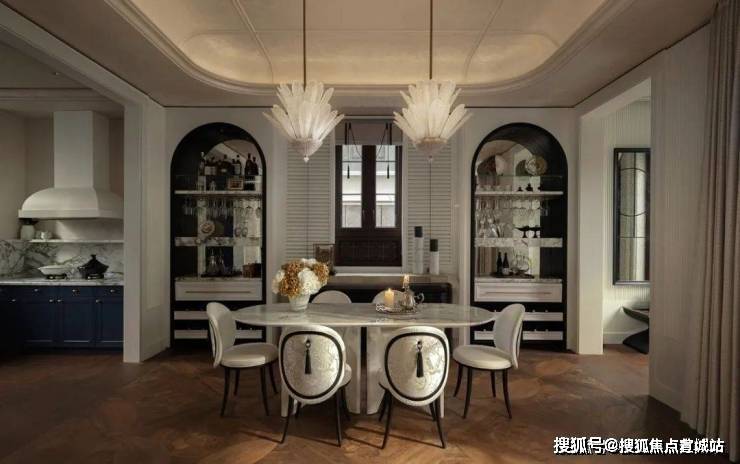 沉浸在这家餐厅的现代魅力之中,黑白色调的强烈对比勾勒出它的时尚轮廓.复古风情与浪漫氛围在此交织,如同一场优雅的邂逅.轻盈如羽翼的吊灯,宛如盛开的花朵,悬挂在双拱形酒柜前,散发出一种高雅而精致的气息.
