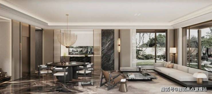色彩设计以香槟金色作为主色调,营造古朴、大气的形象。奢华石材作为深色点缀,使葱郁的景致层次更为丰富,宛如一幅和谐细腻的中国画。