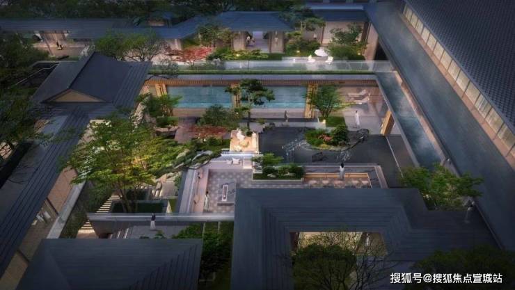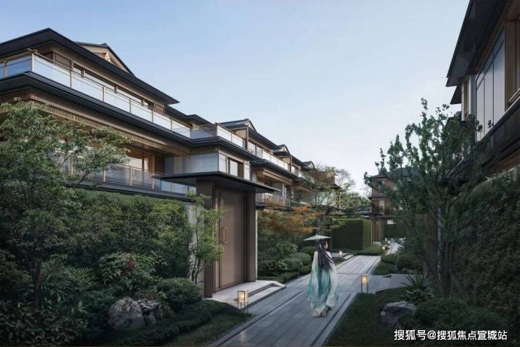 住宅立面设计延续了宋式建筑水平、简洁、飘逸的审美精髓,私人庭院内采用传统园林“堆山、叠石、理水”的造园手法,并以建筑、灌木、小桥和流水,构建起高、中、低三个层次的景致。