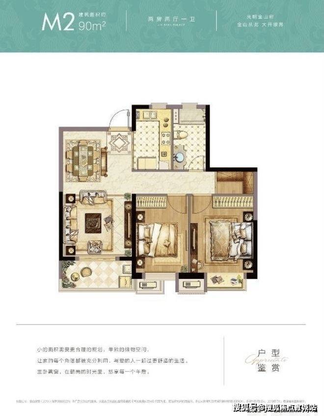 建面约90㎡2房2厅1卫,两间卧室朝南,舒适尺度搭配观景阳台,干湿分离的独立卫浴.