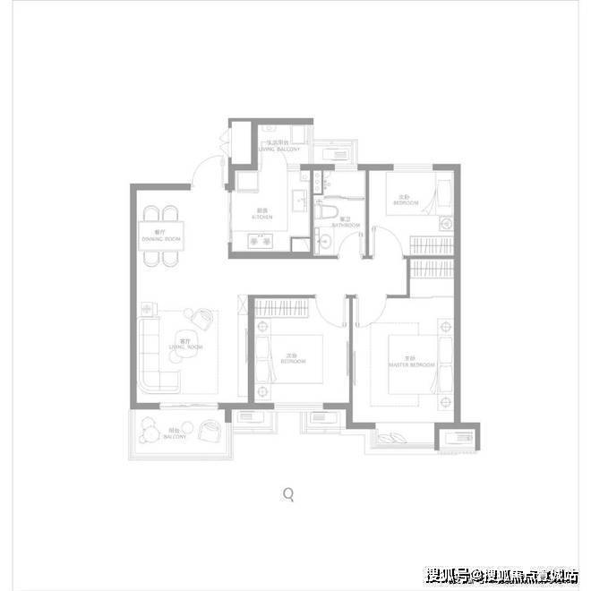 建面约116㎡三房两厅两卫,南北通透,户型方正,主卧大套房,带阳台与独立主卫,更舒适的居住尺度.
