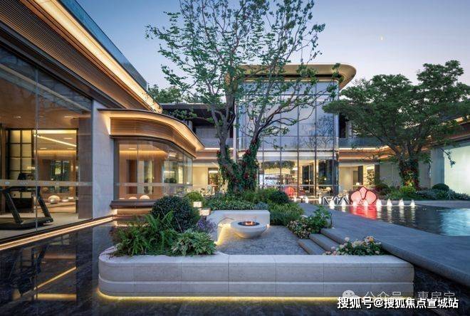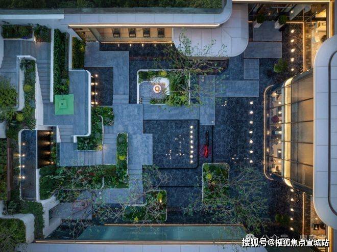 蓝翡翠水景围着下沉庭院,中间有蜿蜒的挑台连着瀑布,顶层还有供业主小聚的女王花厅,实现了美感与功能的完美融合。