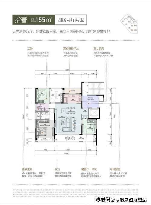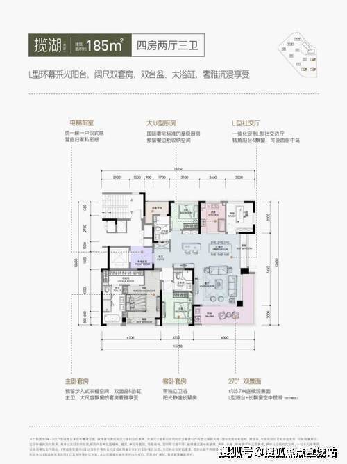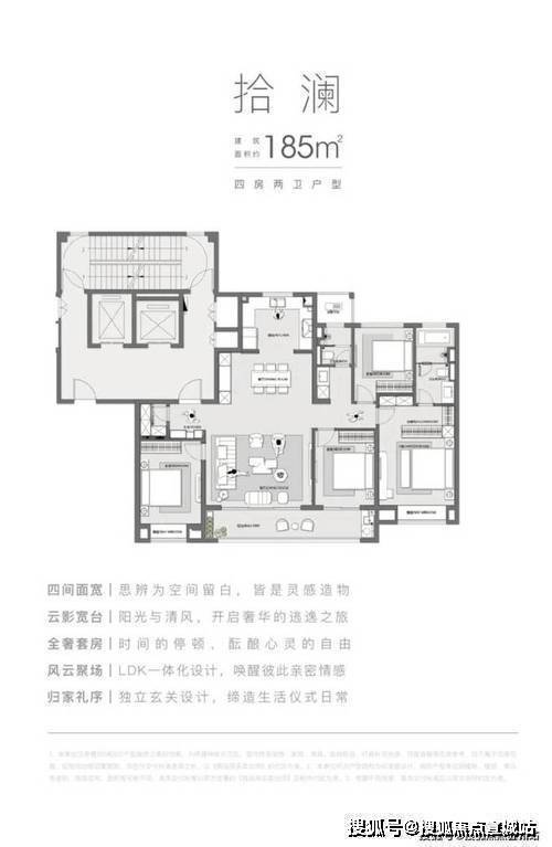 户型特色:户型方正,居住舒适度高。如149㎡户型四开间朝南,约13.6米南向面宽,U型厨房,约7.1米连体大阳台;185㎡户型同样四开间朝南,主卧套房设计,私密性佳。