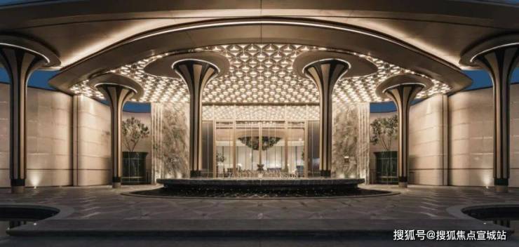项目恢弘大气的门头,项目设计师以浮岛为灵感,将几根立柱化作悬浮的雕塑,撑起一片轻盈的仪式感。