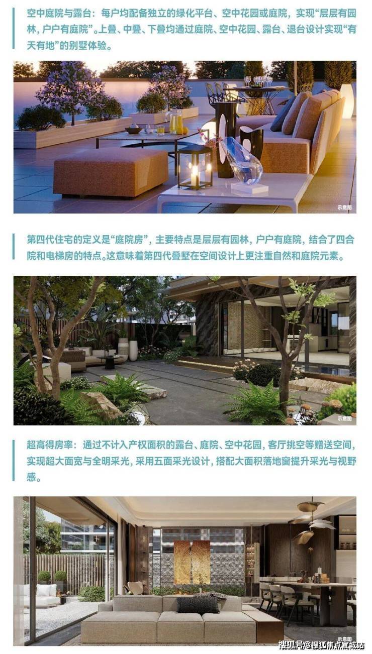 产品创新:太湖湾首座纯血四代墅,采用独创的咬合式设计,实现上下叠户型错层排布,户户有花园、层层有露台,实得率高,上叠实得率高达 192%,下叠实得率 160%-270%。
