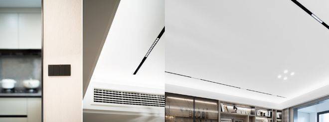 不仅标配了中央空调+新风系统,而且还设计了全屋墙布、不锈钢踢脚线、磁吸轨道灯带设计等等……从装修大件,到细微之处,无一不体现了这个精工国企对于这个社区的匠心。