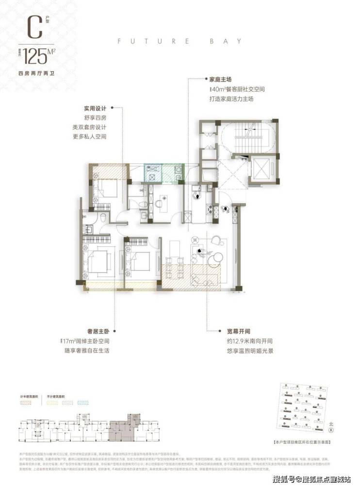 ◎约125㎡:四房两厅两卫,南向面宽约13米,约40㎡餐客厨社交空间。(首次入市,首开无此房源)