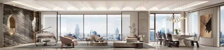 270度天幕景观 :坐落在城市的大平层再搭配270度可观赏的景观,这样就能将城市景观、社区氛围感和居住的私密性同时呈现出来。