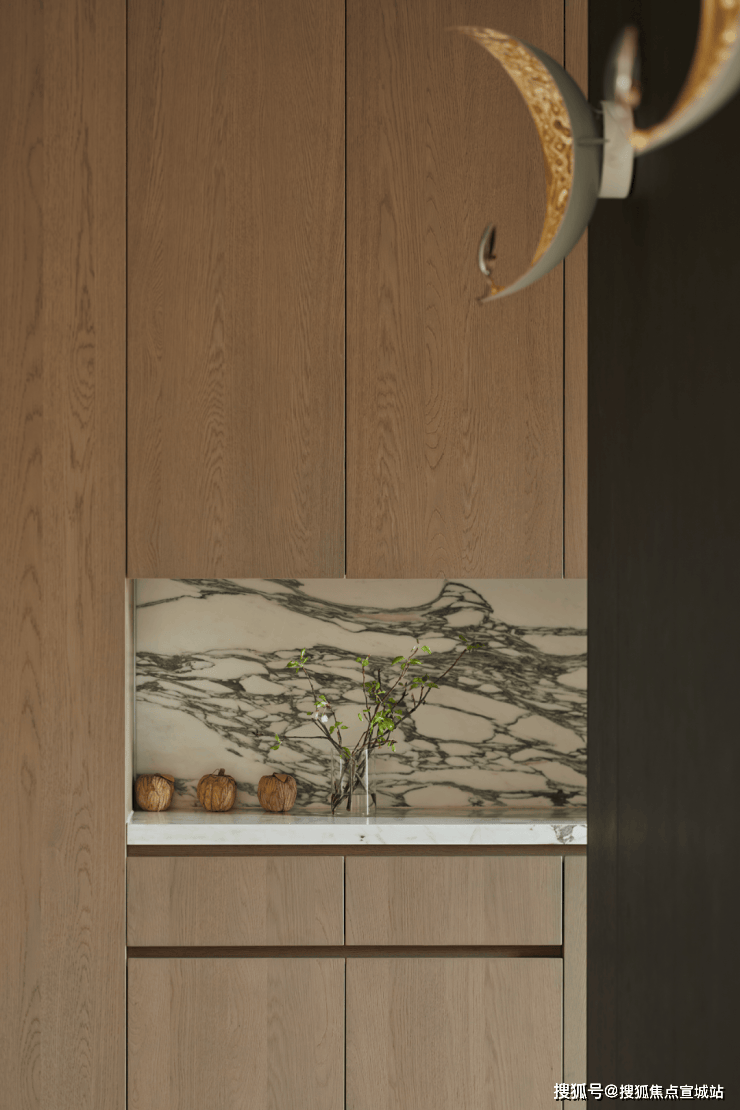 地面延续酒店式落客区海棠纹拼花镶钻,铁打纹工艺,其间还有老石板,青石板,中国黑老石皮,柏坡黄的石皮等原石原面铺装,老石皮从大料里取出,数量少而贵,由此也可看出保利·永兴里在别墅打造上是真舍得,也是真高级。