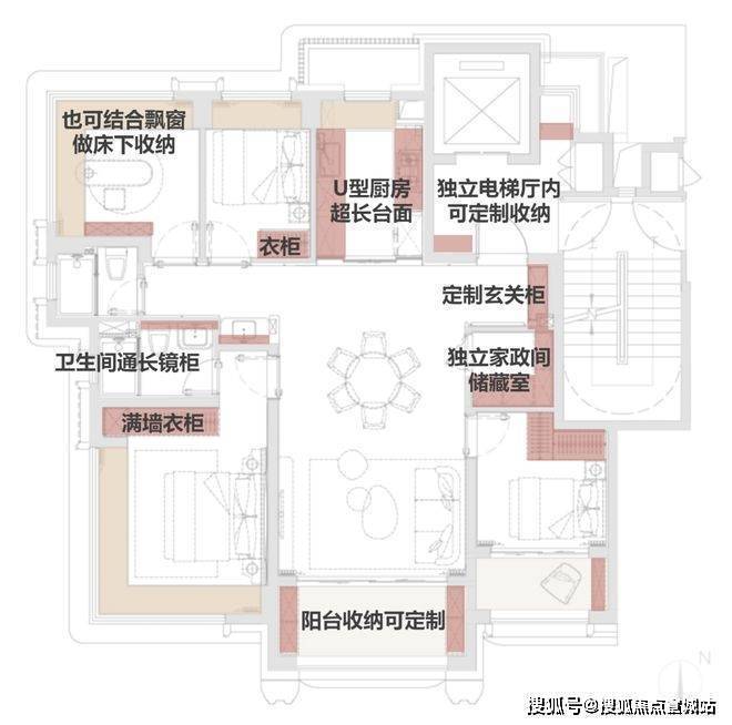 此外,U型厨房上下柜,卫生间镜柜,阳台两侧可定制等等,不同空间中,都有设计预留,且都为真实生活场景而来。