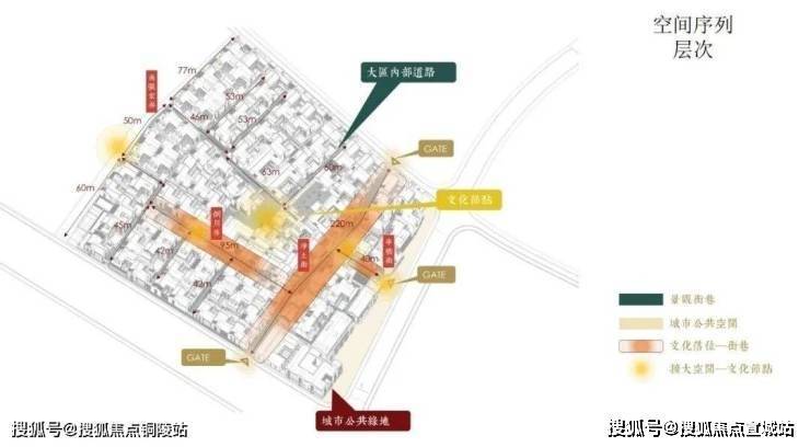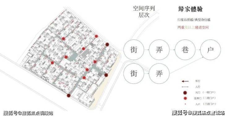 士林润园社区规划可分为蓬莱路城市公共景观以及社区内部景观两个部分,其中市政绿地衔接于上海2035城市总体规划中“蓝绿丝带”的上位条件要求,社区内部街巷空间形成空间序列形成递进的层次,将归家体验的序列依次展开,形成城市街道→入口(一级门户)→街巷→节点空间→里弄门(二级门户)→合院入户(三级门户)的方式,基本可保证大多数住户可体验到两重以上的空间递进。