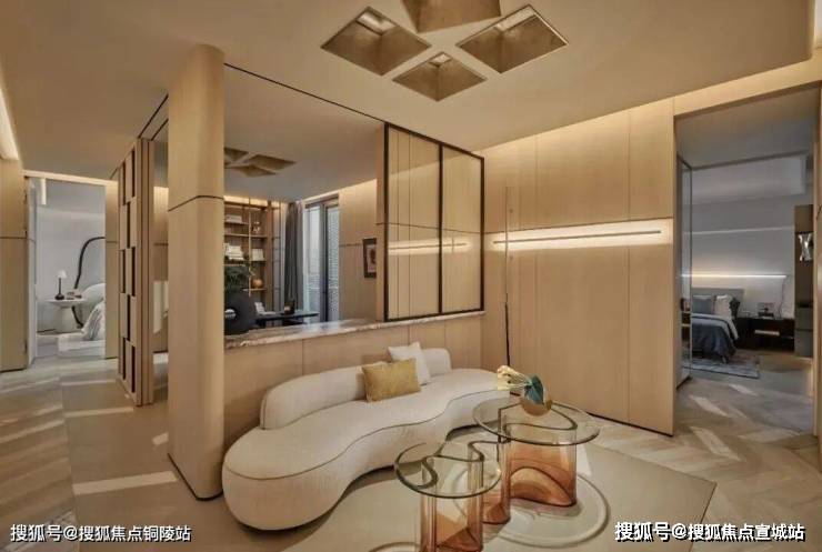 顶层专属于主卧,推开双开门,拱形天花设计尽显浪漫,挑高至3.8米,一条长灯带自浴室贯穿至整个卧房,分置于灯带两侧的弧形结构,环抱出一份安心。而其床头背板也被设计成拥抱的视效,为空间增添温暖包裹的氛围。