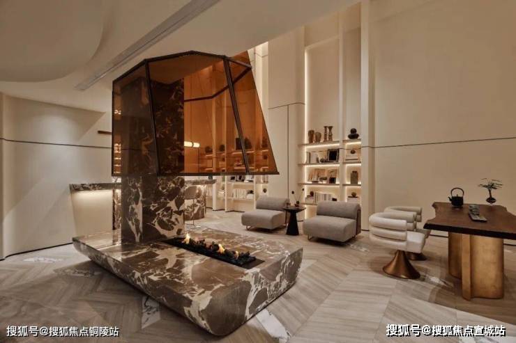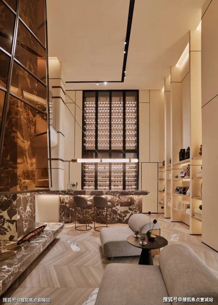 这一层更聚焦于私谈、影音、娱乐、品酒、饮茶,深沉又静谧。近6米高的垂直挑空玻璃壁炉矗立于眼前,如同一件令人赞叹不已的大型雕塑装置,它弱化了空间中的大理石承重柱,将其纳入共同构成一个完整的全新的装置,集功能性与艺术性于一身。