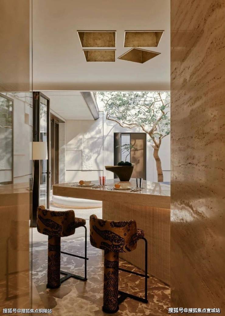 阅读区与茶室围绕在侧,更有配齐Dry Kitchen的酒吧。饮茶时光里,上层室外庭院的水景天窗在此投下变幻光影,让地下层亦浸润在盈莹逸动之中,且赋予整个空间艺术剧场般的特色。