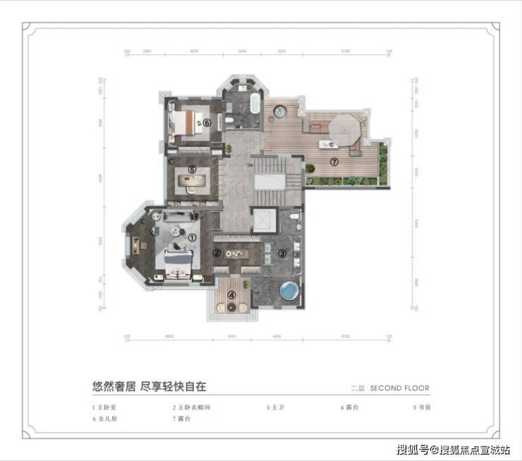卧室配置更衣室、卫生间及阳台。主卧更显奢华,独立书房及步入式衣帽间诠释由内而外的儒雅气质,开阔露台留给诗和花的自由空间。