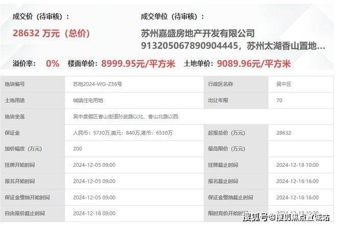 又见江南院,即苏地2024-WG-Z36号地块项目,位于吴中度假区香山街道孙武路以北、香山北路以西,在去年12月由苏州嘉盛房地产开发有限公司、苏州太湖香山置地有限公司以底价28642万元竞得,成交楼面价为9000元/㎡。