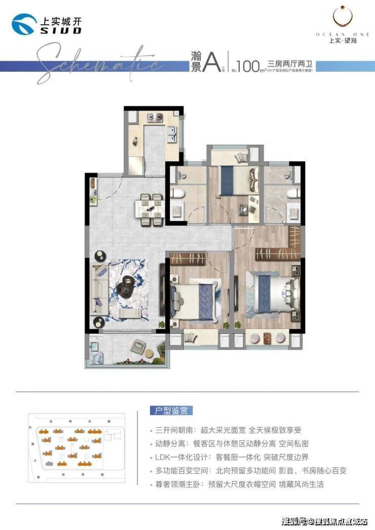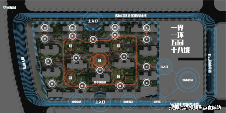 社区采用人车分流设计,在景观规划上,上实望海采用“一界一环五园十八境”景观法则,侧写九大生活场景。
