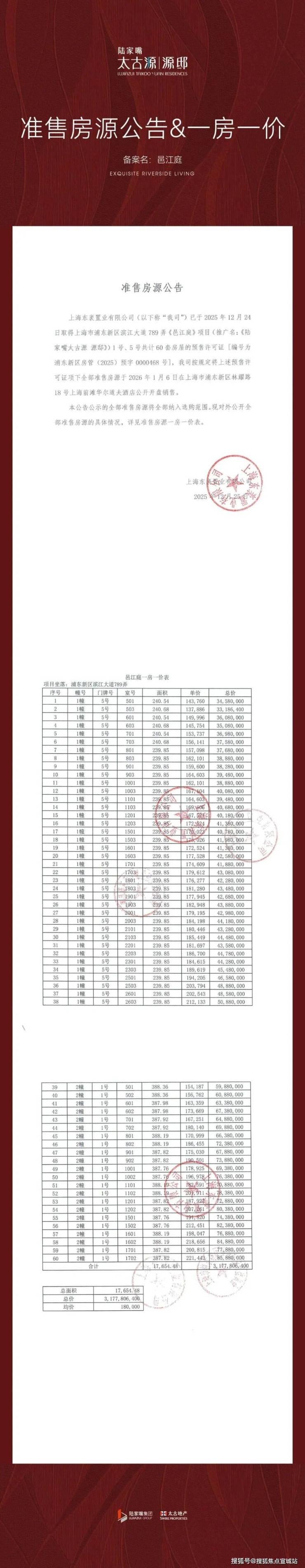 陆家嘴太古源源邸项目提供官方联系方式,售楼处电话400-885-1337,预约看房,认购时间2025年12月26日至30日,均价18万/㎡。