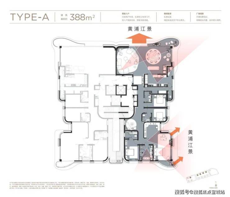 建面约388㎡户型,位于滨江首排、江景0遮挡。