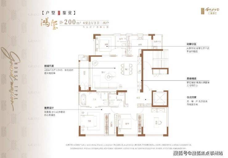 建面约200㎡4房2厅3卫户型,做到了三开间朝南+主卧豪华套房设计+南北通透,保证每个家庭成员都能有自己独立的居住空间,私密性拉满。