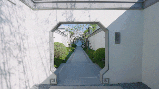 经过中心园林之后,就是通往“家”的江南巷道。白色的墙、翠绿的竹,阳光投射下来与竹林形成影影绰绰的光斑投射在墙面,美不胜收。