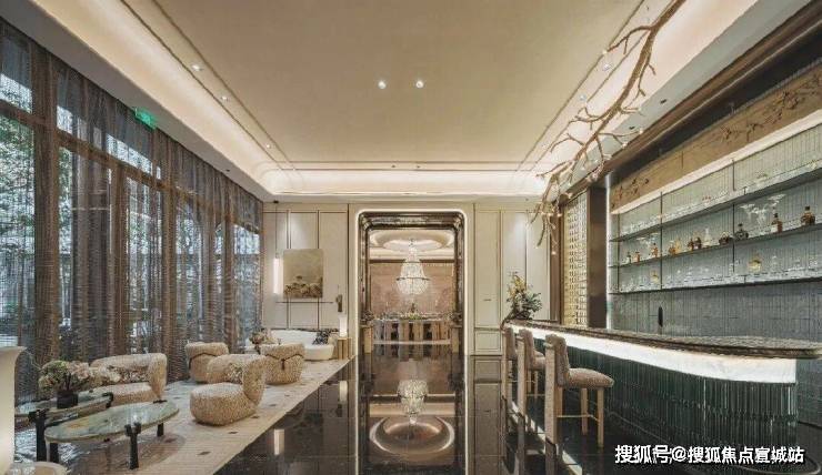 依托着超大落地窗的水吧花房,在宽敞的服务式空间中,以视觉美学与情感共鸣为设计语言,引入“一束雪梅”的艺术灯饰为视觉重点,打造五感沉浸的都市社交绿洲,于此交谈、休憩便能感受极具意境的轻松氛围。