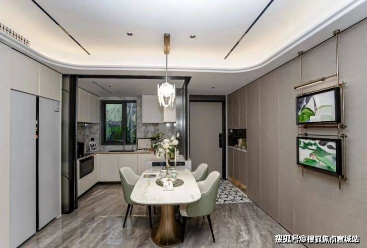 首先是奢石含量极高,从入户处的玲珑玉拼花与透光云石辉映,到翡翠绿奢石墙景、再到发光云石装饰点亮归家路,石材的典雅贯穿始终。